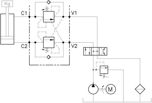 Zawór zwrotno — hamujący (bliźniaczy) używany jest do kontroli ruchu odbiornika oraz jego blokowania w obu kierunkach, co umożliwia kontrolowane opuszczanie ładunku oraz ograniczenie maksymalnego ciśnienia w przypadku szoku spowodowanego niekontrolowanym ruchem, przeciążeniem lub nagłym manewrem.
