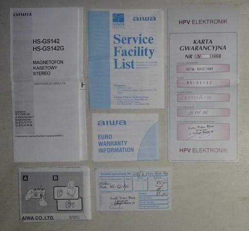 Sprzedaję oryginalną zestaw wydawnictw dotyczących nabycia walkmana Aiwa w 1996 roku. Już go nie mam, ale zostały: dwie instrukcje obsługi, karta gwarancyjna, adresy serwisów, informacje o warunkach gwarancji w Europie i dowód sprzedaży na kwotę 85,00 zł. To było wówczas około 20% mojej miesięcznej wypłaty netto. Stan bardzo dobry z minusem (lekkie ślady używania). Zapraszam na inne moje aukcje.