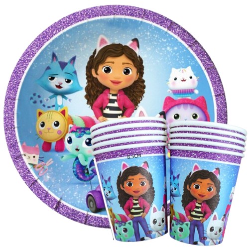- W ZESTAWIE: 10 sztuk talerzyków + 10 sztuk kubków papierowych z bohaterami bajki Koci domek Gabi,