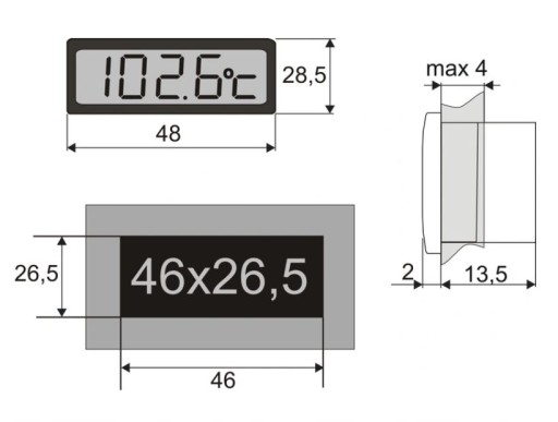 Termometr elektroniczny z wyświetlaczem LCD. Zasilany z dwóch baterii LR44. Zaopatrzone są w zintegrowany czujnik temperatury PTC o wysokiej dokładności i długości 1,5m. Montowany w tablicy na zatrzask. Model wyższej jakości i dokładności od podstawowych modeli termometrów tablicowych, cieszący się dużą popularnością i niezawodnością.