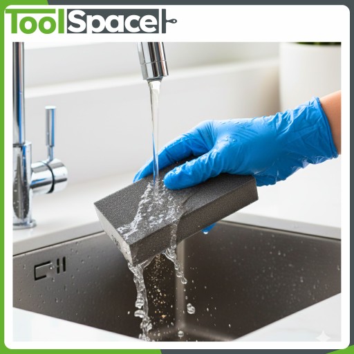 - Na mokro – gąbka doskonale wchłania wodę, dzięki czemu praca staje się czystsza, mniej pyląca, a materiał ścierny wolniej się zapycha. To także skuteczny sposób na wydłużenie jej żywotności i uzyskanie jeszcze lepszych rezultatów.