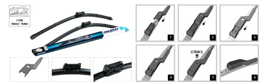 Wycieraczki bez konstrukcji szkieletowej ze zintegrowanym spojlerem, zawsze w komplecie dwie wycieraczki na przednią szybę, posiadają dedykowane mocowania oraz odpowiednie długości ( mm ) przeznaczone do konkretnego modelu auta.