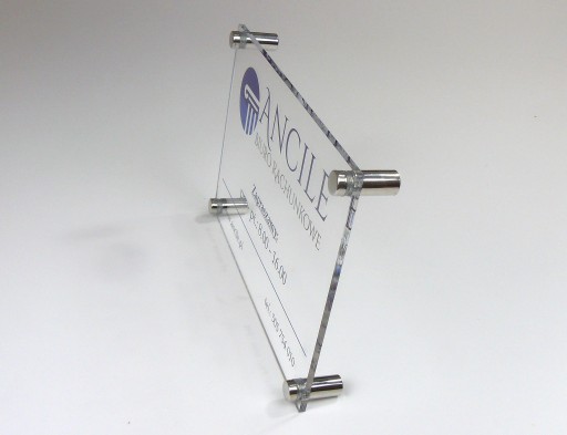 Tabliczka firmowa wykonana jest innowacyjną metodą druku UV na wysokiej jakości plexi przeźroczystej o grubości 4 mm. Tabliczka posiada otwory i zaopatrzona jest w cztery dystanse ułatwiające jej przymocowanie. Całość tworzy bardzo elegancką kompozycję.
