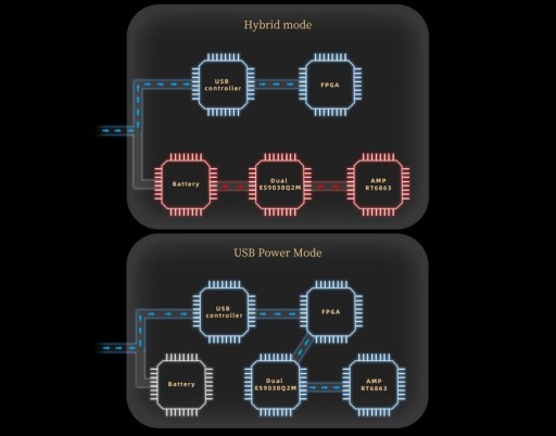 Jednym z największych wyróżników Shanling UA5 jest tryb hybrydowego zasilania, który został stworzony specjalnie dla tego modelu. Oznacza to, że część podzespołów, w tym kontroler USB i układ FPGA, pobierają prąd bezpośrednio z USB, ale DAC/AMP może zasilać kluczowe elementy odpowiedzialne za jakość dźwięku, a więc układ DAC czy dedykowane wzmacniacze, bezpośrednio z wbudowanej baterii o pojemności 220 mAh.