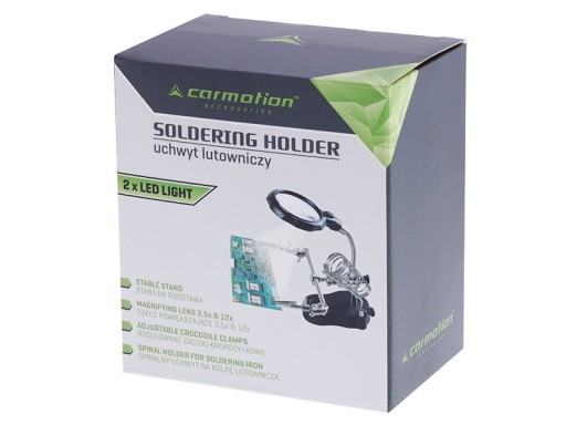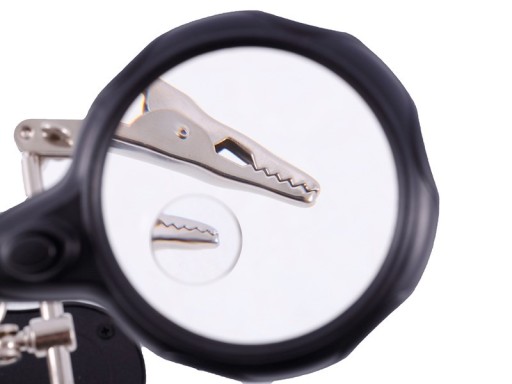 - LUPA – wyposażony został w lupę, montowaną na spiralnym ramieniu na kolbę lutowniczą z możliwością demontażu. Dzięki temu ustawisz w dowolnej pozycji.