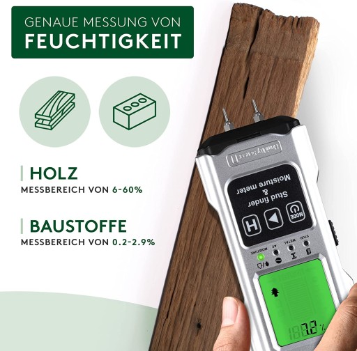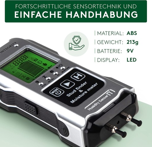 - Praktyczny wszechstronny: kompaktowy wykrywacz kabli to lokalizator kabli, wilgotnościomierz i termostat w jednym. Dzięki temu można również mierzyć temperaturę otoczenia i wilgotność w ścianie, a tym samym zapobiegać uszkodzeniom materiału budowlanego