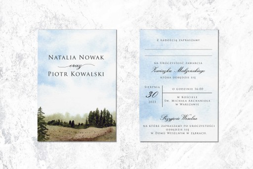 ZAPROSZENIA ślubne z motywem krajobrazów, idealne na Twój ślub w stylu rustykalnym. Zaproszenia dla Państwa Młodych, którym bliska jest relacja z naturą. Grafika imituje obraz malowany akwarelami, który w połączeniu z piękną fakturą papieru tworzy wyjątkowe dzieło. Zaproszenie będzie idealne na wesela w stylu greenery, boho, rustykalne.