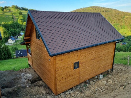 Oferujemy domek letniskowy o wymiarach 5x7 metrów, z poddaszem użytkowym podzielonym na dwa pomieszczenia , wyposażonym w zadaszony taras o wymiarach 2x7 metrów. Domek został wykonany w technologii szkieletowej z drewna świerkowego pochodzącego z Beskidu Żywieckiego i posiadającego klasę c24. Elewacja składa się z desek świerkowych grubości 2 cm, a całość została zaimpregnowana w dowolnym kolorze wybranym przez klienta. Standardowo domek jest pokryty gontem bitumicznym. W cenie oferty zawarte jest ocieplenie domku 15 cm wełną oraz paraizolacja, okna PCV IGLO 5 oraz drzwi stalowe. Domek może być zbudowany na lekkim fundamencie z bloczków betonowych na przygotowanej podbudowie Możemy również wykonać dla Państwa fundamenty w postaci płyty żelbetowej lub słupów fundamentowych. Montaż całego domku zajmuje około 4 dni i jest realizowany przez naszą firmę. W cenie ogłoszenia zawarty jest również transport do 100 km od miejscowości Węgierska Górka. Serdecznie zapraszamy do skorzystania z naszej oferty.