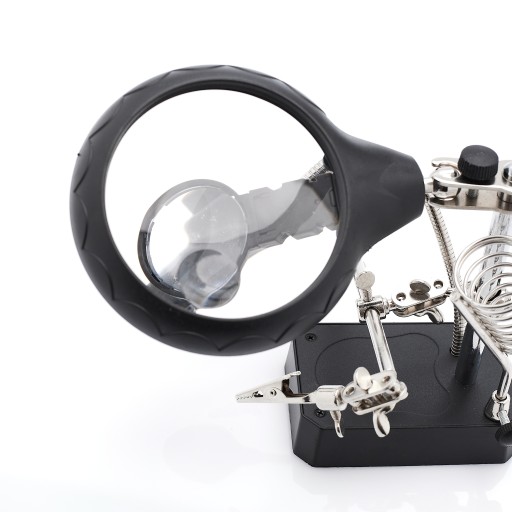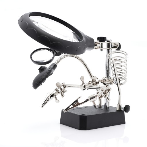 Doskonały uchwyt montażowy wyposażony w podświetlenie oraz 3 lupy z różnymi powiększeniami i średnicą, dodatkowo całość doposażono w uniwersalny uchwyt na lutownicę. Jest to niezbędne akcesorium dla każdego elektronika, jubilera, numizmatyka, zegarmistrza czy serwisanta elektroniki.