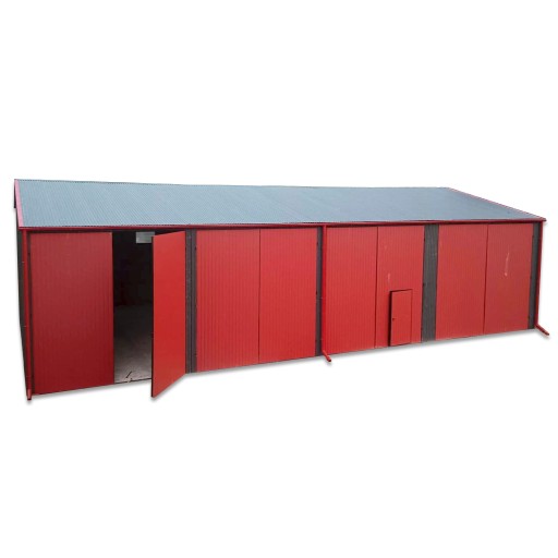 Hala magazynowa o wymiarach 12x10 m, sprawdzi się idealnie pod firmę, gospodarstwo rolne lub do celów prywatnych. Jej powierzchnia użytkowa to 200 mkw, a wewnątrz nie znajdują się żadne słupy podporowe. Dach wykonany został z kratownic z profili zamkniętych, przez co wszelkie obciążenia zostają równomiernie rozłożone na konstrukcji hali i ścianach. Profile zamknięte użyto również do ścian. Cała konstrukcja jest zabezpieczona anty-korozyjnie i jest niezwykle wytrzymała oraz solidnie wykonana. Blaszak, magazyn, hala produkcyjna została obłożona pierwszym gatunkiem blachy trapezowej akrylowej w pięknym kolorze grafitowym. Na frontowej ścianie garażu znajdują się cztery bramy - dwie dwuskrzydłowe 290x400 cm. W hali blaszanej zamontowano również dodatkowe wejście.