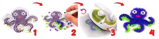 Na przygotowanej plastikowej formie z wypustkami układa się z koralików wybrany wzór. Dziecko może się tym zająć samo lub z przyjaciółmi. Gdy obrazek jest już skończony, przykrywamy go pergaminem do prasowania lub papierem do pieczenia i zaprasowujemy żelazkiem klasycznym (nie parowym!). Na tym etapie przyda się pomoc osoby dorosłej, chociaż starsze dzieci poradzą sobie same, mając np. małe żelazko turystyczne. Pod wpływem temperatury koraliki stopią się i po odklejeniu papieru otrzymamy gotowy obrazek. Aby koraliki wytopiły się poprawnie, należy zwrócić uwagę na temperaturę żelazka, jeśli zauważysz, że plastikowa podkładka zaczyna się wyginać lub topić natychmiast przerwij prasowanie.