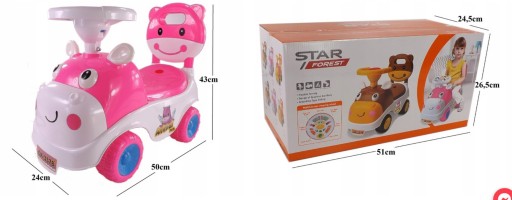 - Koła jeździka są skrętne i łączone solidnym metalowym prętem.