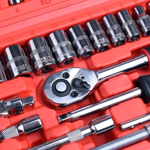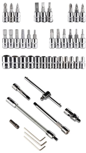 Zestaw 46 kluczy wykonanych ze stali crv oraz chromowo-wanadowej obrabianej cieplnie.
