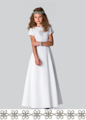 Sukienka pierwszokomunijna wykonana jest z białej, ładnie układającej się tkaniny.