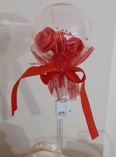 Ta bardzo ładna dekoracja, sprawdzi się jako doskonały prezent dla każdej zakochanej pary, lub do dania bez żadnej szczególnej okazji. Trzy piękne różyczki, zostały umieszczone w przezroczystej kulka przypominającej balon, wraz ze styropianowymi, lekkimi kulkami w kolorze. Bardzo ładny prezent dla ukochanej. Możesz go również wręczyć z okazji Walentynek, Dnia Matki jak również w Dzień Babci, Dziadka a także wtedy, gdy chcesz w unikalny sposób uczcić Dzień Kobiet!