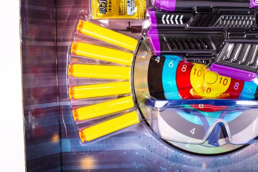 W zestawie znajduje się 6 strzałek, okulary oraz pistolet.