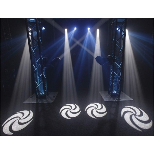 Głowica posiada rotacyjne ✅dwukierunkowe koło 7 kolorów, statyczną oraz obrotową tarczę gobo, na których znajduje się łącznie 14 wzorów kształtujących wiązkę, a także 3-ramienny, obrotowy pryzmat z regulacją kierunku i prędkości obrotów.