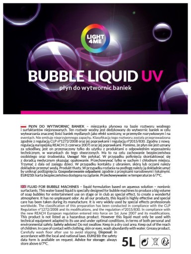 LIGHT4ME BUBBLE FLUID UV 5L to profesjonalny, bezzapachowy i bardzo wydajny płyn UV do wytwornic baniek powstały na bazie mieszanki czystej wody i surfaktantów niejonowych. Roztwór znajduje szerokie zastosowanie, szczególnie w przemyśle rozrywkowym.