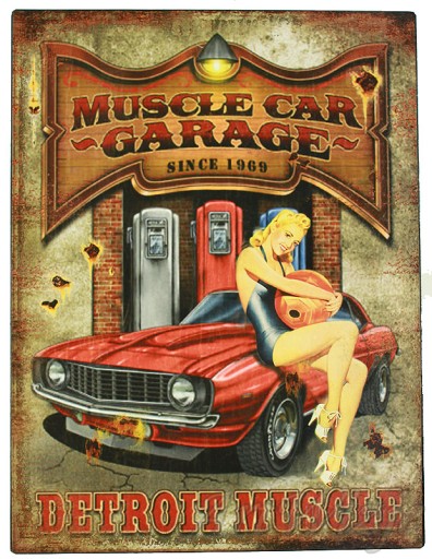 Metalowy plakat retro przedstawiający młodą atrakcyjna kobietę siedzącą na Muscle Car i reklamująca usługi amerykańskiego warsztatu samochodowego z Detroit.