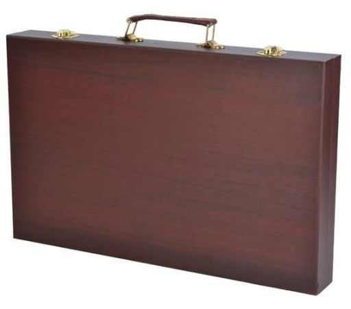 Całość umieszczona jest w eleganckiej, rozkładanej walizce, która została zrobiona z drewna, co niewątpliwie podwyższa jej walory estetyczne, jak również wpływa na trwałość. Walizka posiada wytrzymałą, skórzaną i wygodną rączkę, dzięki czemu transportowanie pełnej zawartości jest proste i komfortowe, a także zwiększa satysfakcję z użytkowania. Metalowe, mocne klamry gwarantują, że podczas przenoszenia walizka będzie szczelnie zamknięta i nic się z niej nie wysypie ani niczego nie zgubimy.