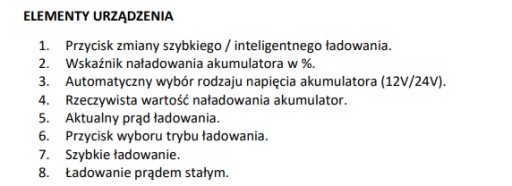 - Overheating protection (Zabezpieczenie przed przegrzaniem ładowarki): Kiedy temperatura ładowarki przekroczy 150°C, ładowarka przestanie ładować. Kiedy nastąpi obniżenie temperatury do 80°C lub wyłączy się prostownik na ok. 10 min, po tym czasie można ładować akumulator ponownie.