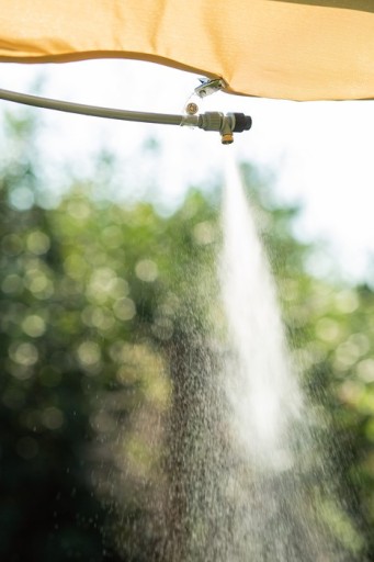 Kurtyna wodna służy do ochłody latem dzięki wytworzeniu przez drobnooczkowe dysze delikatnej mgiełki. Parująca woda pobiera ciepło z otoczenia doprowadzając do schłodzenia powietrza w upalne dni o max. 10stC. Efekt chłodzący nie jest gwarantowany niezależnie od warunków otoczenia, gdyż jest uzależniony od panującej aktualnie temperatury powietrza i wody. Im wyższa temperatura powietrza i silniejsza operacja słoneczna tym efekt chłodzący jest większy. Im niższa temperatura wody np. pobieranej z pompy głębinowej, tym efekt chłodzący jest większy.