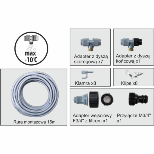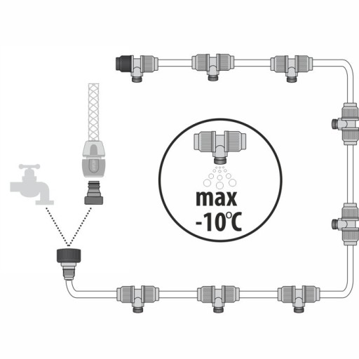 Instalacja dysz możliwa jest w dowolnych odstępach na odcinku 15m rury montażowej, jednak rekomenduje się ich instalację co 60-100cm w linii poziomej. Mocowanie dysz na jednej linii umożliwia uzyskani efektu kurtyny wytworzonej z mgły.
