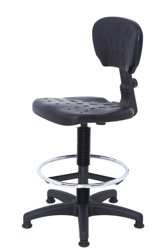 Antypoślizgowe i ergonomiczne siedzisko w czarnym kolorze (RAL 9005). Regulacja wysokości siedziska za pomocą mechanizmu ruchowego CPT. Podnóżek okrągły, chromowany bez regulacji. Podstawa z poliamidu z włóknem szklanym, wyposażone standardowo w stopki, istnieje możliwość wymiany na kółka, szczegóły poniżej.