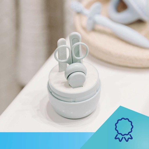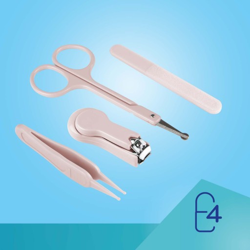 Zestaw do obcinania paznokci dla niemowląt składa się z 4 elementów – nożyczki, poręczny obcinacz do paznokci, delikatny pilniczek i pęseta.
