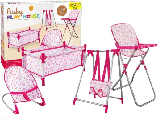 Zestaw który bardzo realistycznie odzwierciedla prawdziwe łóżeczko turystyczne , krzesełko do karmienia ,huśtawkę oraz leżaczek .