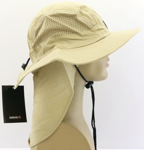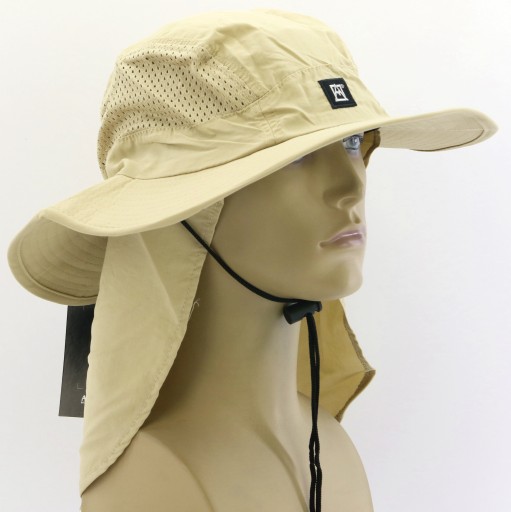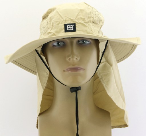 Kapelusz posiada sznurek ze stoperem, który zapobiega zwiewaniu kapelusza z głowy, siatkę u góry która zapewnia optymalną wentylację głowy, oraz osłonę na kark.
