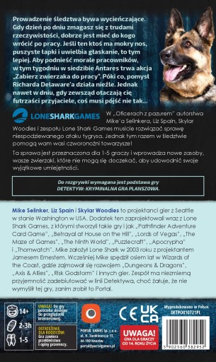 Detektyw: Oficerowie z pazurem to dodatek do Detektywa: Kryminalnej gry planszowej autorstwa Ignacego Trzewiczka (Robinson Crusoe: Przygoda na przeklętej wyspie, Osadnicy: Narodziny imperium, Stronghold). Autorami scenariusza do gry są Mike Selinker, Liz Spain i Skylar Woodies, członkowie prestiżowego zespołu Lone Shark Games. Dodatek wprowadza do gry nowy element - Zwierzaki oficerów, które wesprą graczy swoimi unikatowymi umiejętnościami i zdolnością niwelowania Stresu. Ponadto, dzięki nowej akcji Zdecyduj teraz!, rozgrywka nabiera tępa, stając się bardziej realistyczną. W Oficerów z pazurem zagramy przy użyciu wszystkich podstawowych komponentów z Detektywa oraz nowej, liczącej 35 kart talii kart Tropów. Dzięki instrukcji mającej zaledwie trzy strony będziemy mogli błyskawicznie przystąpić do nowego śledztwa, dotyczącego Canta Parellisa. Słynny treser zwierząt został w czasie ćwiczeń zaatakowany przez tygrysa. Czy za wypadkiem stoi wściekłe zwierzę, czy może coś jeszcze?