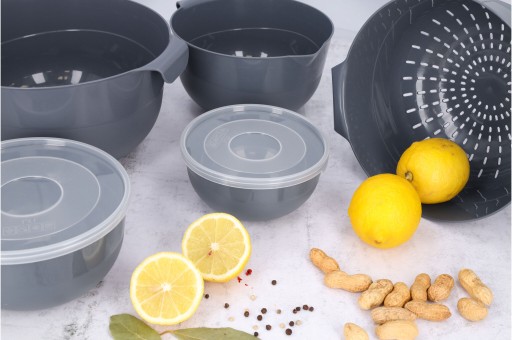 Dzięki możliwości wkładania jednej miski w drugą, zestaw zajmuje minimalną ilość miejsca w szafce lub szufladzie. Miski można również używać do przechowywania żywności w lodówce, co czyni je wyjątkowo praktycznym elementem każdej kuchni.
