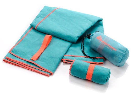 Ręczniki posiadają wszytą gumkę, która pozwala na zwinięcie ich w rulon i bardzo łatwy transport.