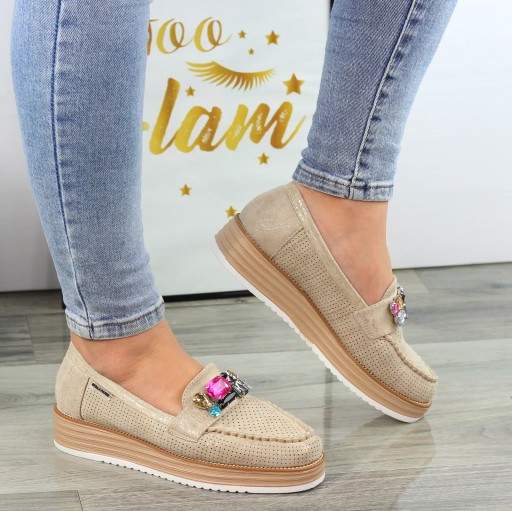 Modne beżowe zamszowe mokasyny na grubej podeszwie ze kolorowymi kryształkami Glam lekkie wygodne