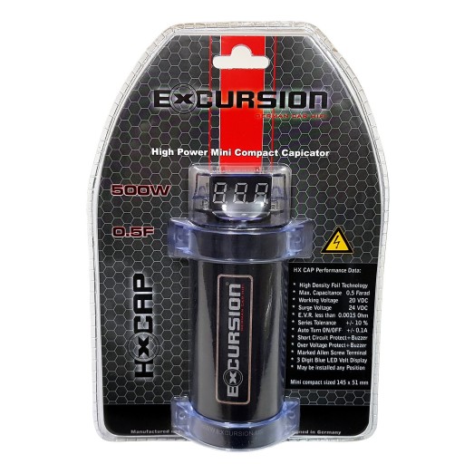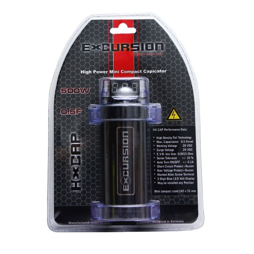 Dzięki zastosowaniu najnowszej technologii HDFT (High Density Foil Technology) ze zwiększoną gęstością wewnętrznych folii elektrodowych możliwe było uzyskanie wysokiej wydajności przy zachowaniu bardzo małych wymiarów obudowy. Kondensator Excursion HX CAP jest w stanie pełnić funkcję efektywnego banku energii stabilizującego impulsowe spadki i wahania napięcia w instalacjach zasilających systemy car audio o mocy do 500 W. Wysoka wydajność i niewielkie wymiary kondensatora to jedne z ważniejszych parametrów w dobie coraz mniejszych i mocniejszych wzmacniaczy cyfrowych powszechnie stosowanych w instalacjach car audio. Dzięki temu miniaturowy Excursion HX CAP stwarza większe możliwości montażu w trudniej dostępnych miejscach samochodu. Likwiduje też wiele ograniczeń przeszkadzających dotychczas w tym, aby taki dodatkowy bank energii dla wzmacniacza mocy zawsze był zainstalowany możliwie jak najbliżej niego. Głównym zastosowaniem kondensatora Excursion HX CAP jest jego montaż bezpośrednio przy wzmacniaczu mocy lub wzmacniaczu z procesorem DSP zasilanym wiązką typu ISO Plug&Play z przewodami o niezbyt dużym przekroju.