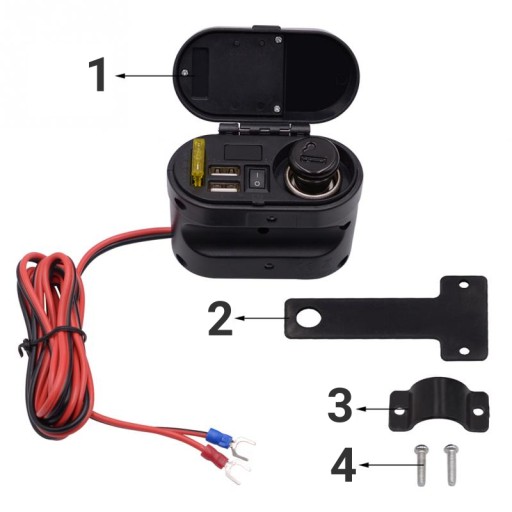 Wodoodporne gniazdo zapalniczki do motocykla, skutera, quada. Wyposażony w woltomierz pokazujący napięcie ładowania akumulatora. Dodatkowo dwa mocne porty USB 5V 3.1A oraz zegarek.