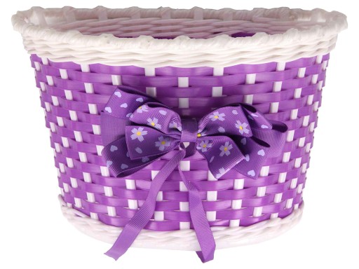 Koszyk na kierownicę rowerową dla dzieci marki VERSO. Wykonany został z bardzo lekkiego tworzywa sztucznego w kolorze fioletowo-białym, ozdobiony piękną dużą kokardą. Koszyk jest przypinany za pomocą specjalnych pasków, które znajdują się w zestawie. Można go zamontować do większości rowerów dziecięcych, jest idealny do przewożenia drobnych przedmiotów przez najmłodszych rowerzystów. Koszyk Verso jest bardzo lekki, dlatego nie powoduje dyskomfortu podczas jazdy, natomiast zapewnia praktyczne i wygodne rozwiązanie. Idealne na rowerowe przejażdżki, a także jako stylowy dodatek.