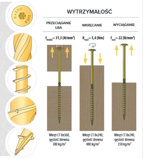 Wkręty ciesielskie CT w pełni zastępują gwoździe budowlane i nie wymagają nawiercania. Doskonałe w budownictwie drewnianym i stolarstwie, w konstrukcjach szkieletowych, konstrukcjach hal itp.