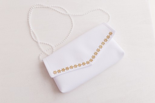 Torebka uszyta jest ze śnieżnobiałej tkaniny komunijnej gabardyna-strecz.