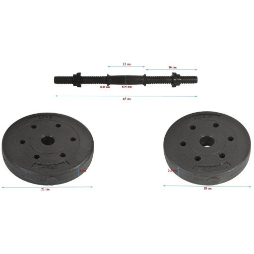 - Materiał: tworzywo ABS (rękojeść), kompozyt (obciążenie), tworzywo sztuczne (gryfy, nakrętki)