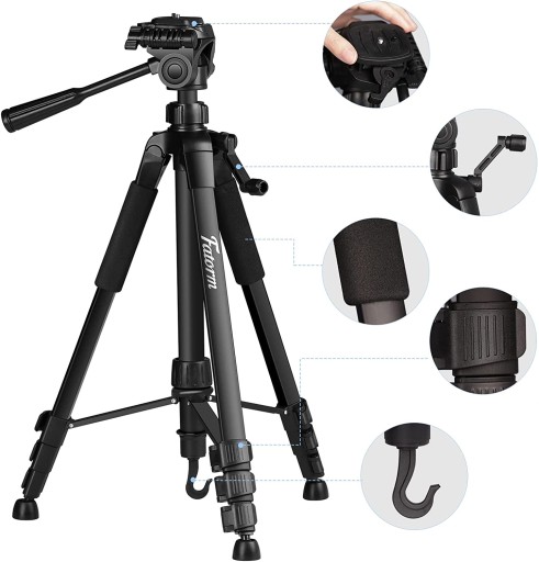 Ten lekki statyw z płytką na śrubę 1/4 pasuje do większości aparatów lub kamer wideo o wadze do 3 kg. Jest szybki i łatwy w konfiguracji i jest wyposażony w torbę transportową ułatwiającą przechowywanie i przenoszenie. Wysokość statywu można wydłużyć od 52 cm do 155 cm, zwycięzca wysokości, na wakacjach można z łatwością postawić aparat na statywie i robić piękne zdjęcia.
