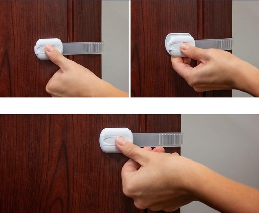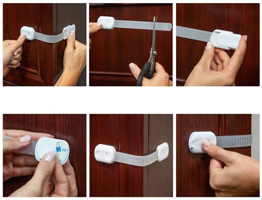 Łatwa instalacja i użytkowanie: blokadę należy przykleić tak, aby jedna jej część znalazła się na drzwiczkach, a druga na ściance szafki lub szuflady.