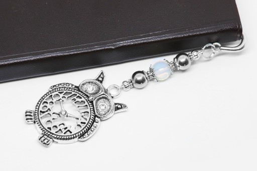 Elegancka zakładka do książki z zawieszką w kształcie sowy z dodatkiem dwóch srebrnych hematytów oraz opalitu.