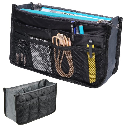 Organizer do torebki posiada dwie kieszenie zamykane na zamek, jedną dużą kieszeń, oraz 10 małych kieszonek bocznych - co daje łącznie 13 oddzielnych przegród o różnej wielkości.