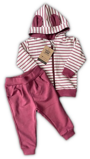 Komplecik składa się ze spodni na gumce, z kieszeniami i bluzy zapinanej na zamek błyskawiczny. Zarówno spodnie jak i bluza wykończone są delikatnymi ściągaczami, które utrzymują ubranko na właściwym miejscu i dodają mu sportowego wyglądu.