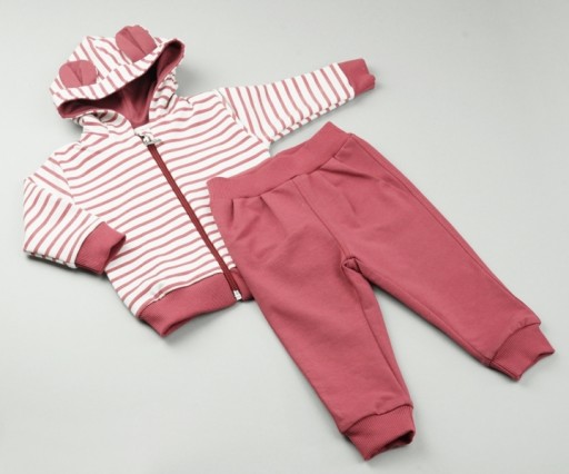 Komplet niemowlęcy bordowych spodni z bluzą w biało-bordowe paseczki. Bluza posiada kapturek, do którego zostały doszyte urocze uszka.