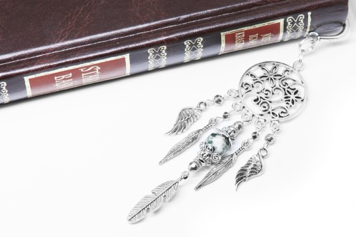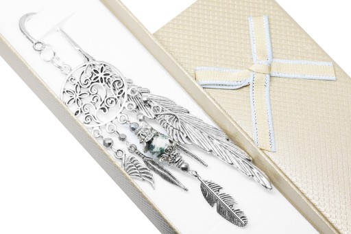Elegancka zakładka do książki z zawieszką z motywem łapacza snów z dodatkiem jaspisu trawiastego oraz hematytu.