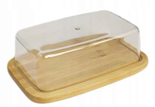 Maselniczka do przechowywania i serwowania masła. Spód maselniczki wykonany z drewna bambusowego, a pokrywka z przezroczystego tworzywa.
