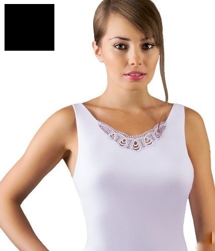 Gładka koszulka damska na szerokich ramiączkach z dekoltem ozdobionym efektowną gipiurą